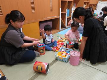 0.1歳のお友だちはプール室で遊びました。保護者の方々が皆でこども達の遊びを見守ってくださっていました。