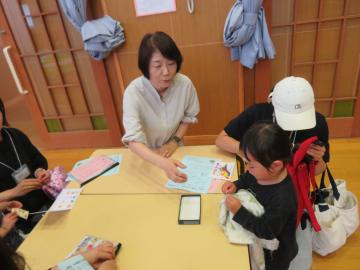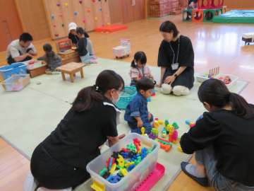 シールを貼ってから遊びます。お家の方と一緒に遊びながら、お友だちの遊びも気にして遊んでいく姿も見られました。