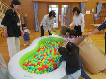 お片付けです。今日はボールプールの沢山のボールを皆で最後まで片付けました。