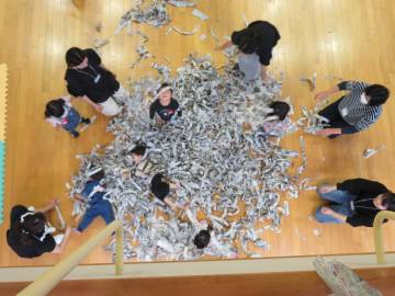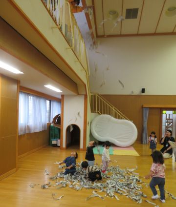 新聞紙をビリビリ破り、ギャラリーから新聞紙の雨を降らせました。下から上を見上げて新聞紙が降ってくるのを大喜びするこどもたち。