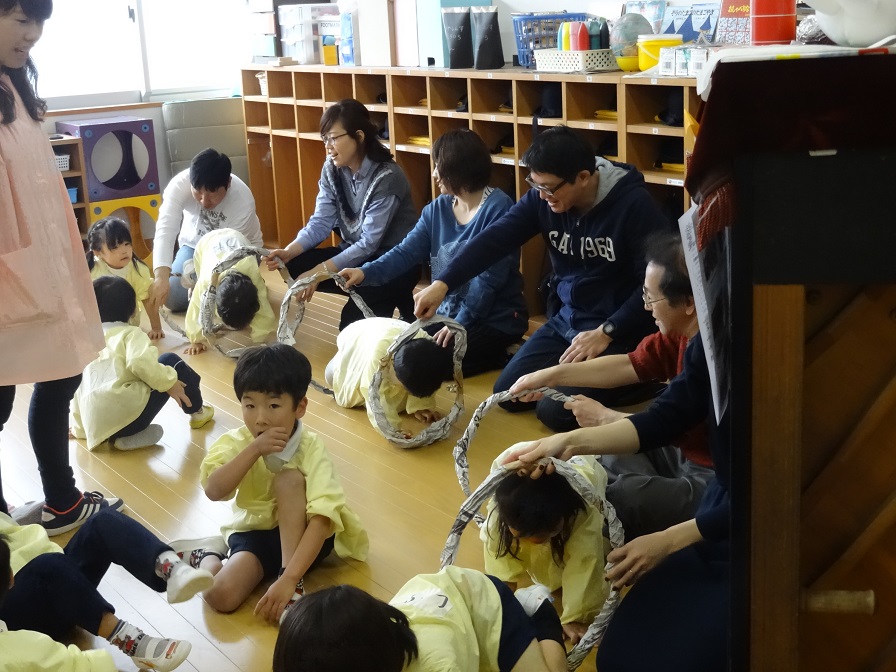 (左)年中:新聞紙で輪を作り、作った輪をみんなで潜って遊んでいるところ。2枚の新聞紙をどのように工夫したら大きな輪になるか考えたり、出来たものでどんな遊びができるか考えたりする子どもと、子どもの発想を更に楽しいものにするにはどんな援助をしたらよいか考える大人。
