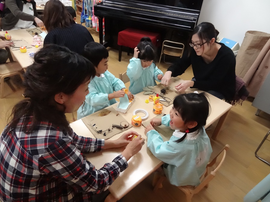 (右)年少:秋の素材を使った壁飾り作り。子どもの発想を受け止め、どのように表現したいのかを探る大人と、技術的なところを補ってもらいながら、学んでいく子どもたち。