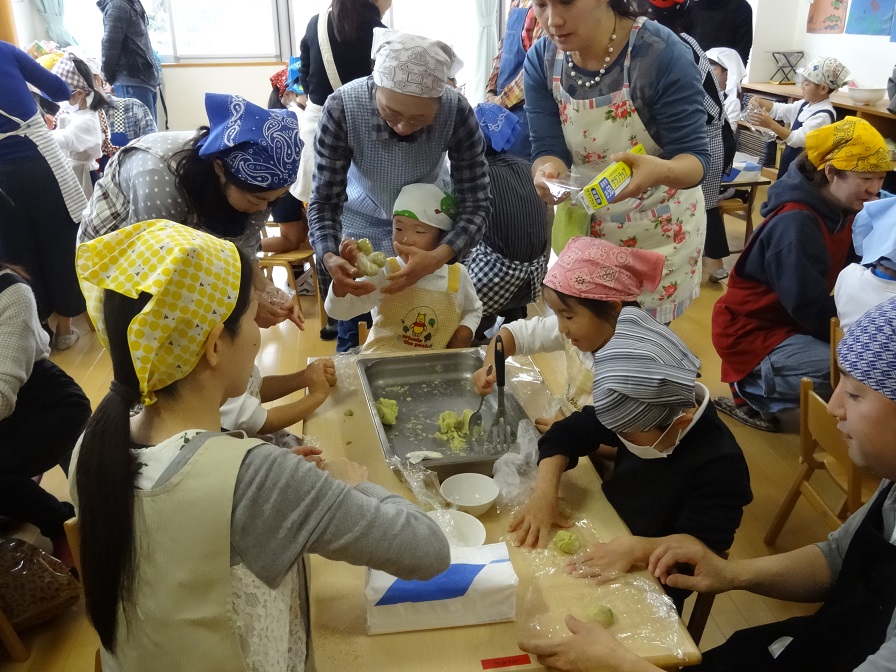 (右)年長:お芋のお料理教室。自分たちで育てたお芋でお料理。手順を教えてもらい意欲的に取り組む子どもと、友達と一生懸命作る子どもたちを、その会話や姿から読み取ろうとする大人。