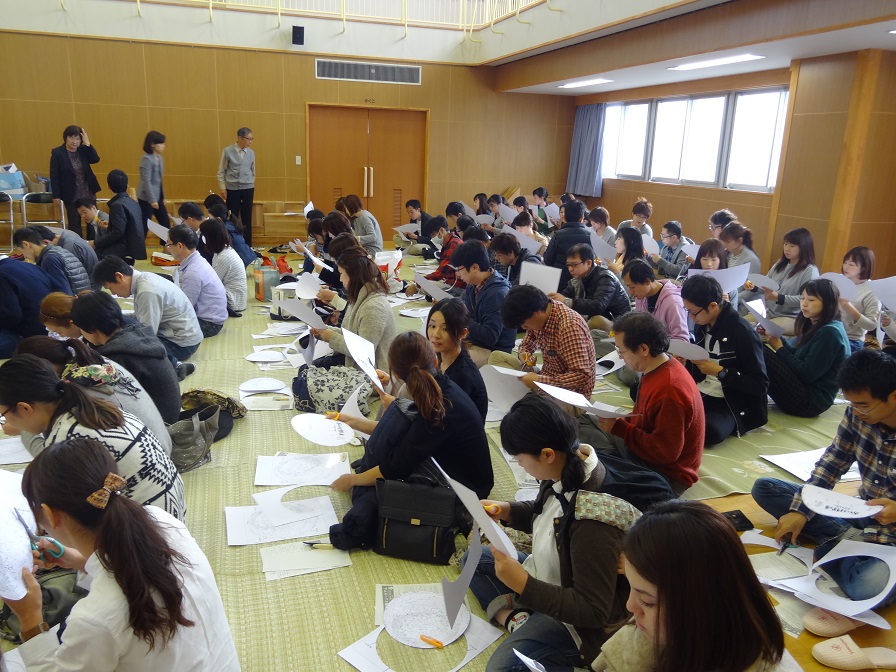 100人を超える参加者の製作のため、遊戯室は茣蓙を敷き、座って行いました。星座早見盤を作って、使い方を教えていただきました。日が暮れるのが早く、早い時間から星空を見ることが出来るようになったので、寒さ対策をしてぜひ親子で星座を探し、星座にまつわる神話を聞かせてあげてください。