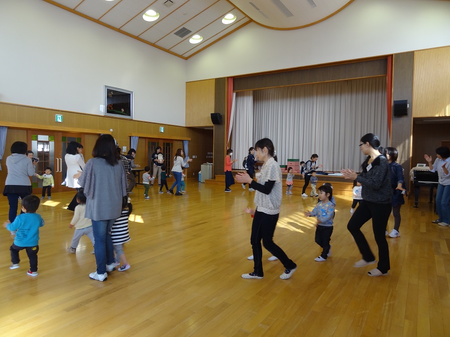 11月10日・11日の『さくらんぼ親子登園』は、親子体操を楽しみました。外部より田中美智子先生(橋北公民館長・元飯田女子短期大学教授)をお呼びして色々な遊びを教えていただきました。