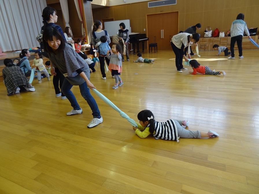 はじめは音楽に合わせて、お母さんと一緒に体をほぐしていきます。次にタオルを使った遊び。タオルに寝転がってお母さんに引っ張ってもらったり、しっかりつかんで引っ張られたり・・・