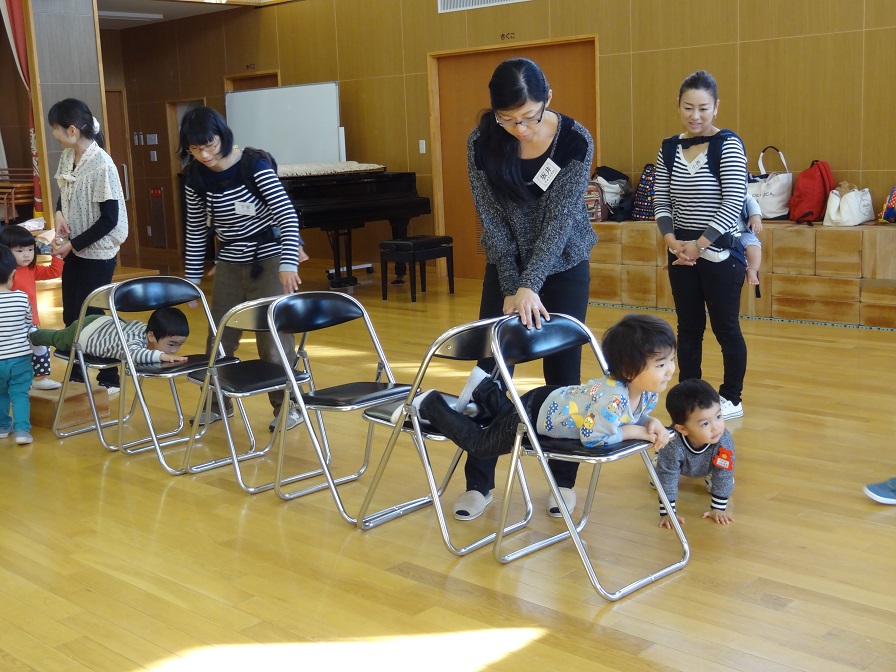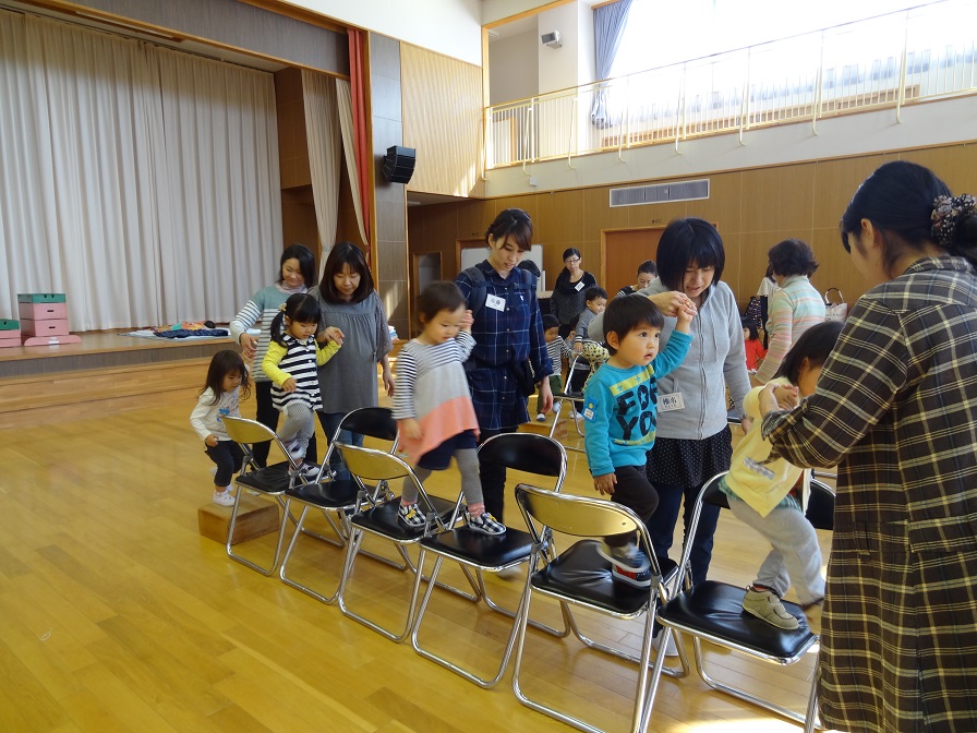 パイプ椅子を並べて、その上を歩きます。椅子の向きを変えるともっと難しくなります。足を大きく上げて、またいで渡ったりもしました。いつもなら「危ないよ!」と叱られるところですが、お母さんに見守られながら、しっかりと渡っていました。