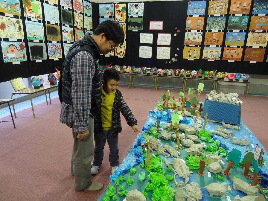 PTA作品展、お母さんやお父さんの作品に感心して見入っている子どもたちでした。