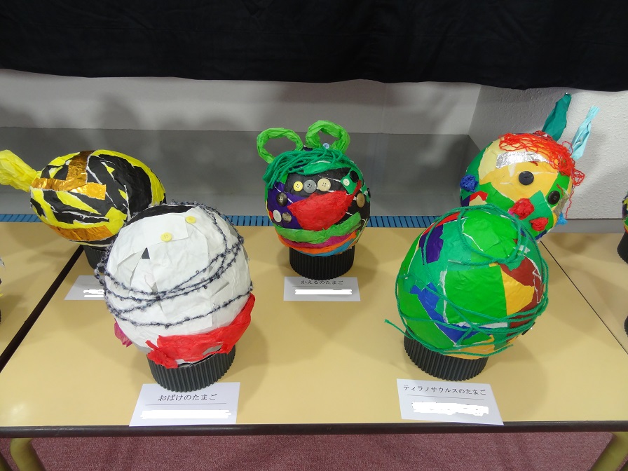 左:年中さんの立体作品「たまご」 様々な材料を貼り付け、色や形から何の卵か命名