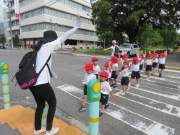 年少さんが初めて園外へ自分たちで歩いて出かけます。信号のある横断歩道の歩き方も確認しながら安全に歩きました。