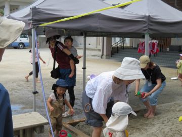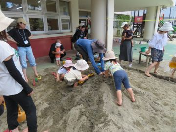 砂場に出てきました。裸足や水の冷たさがが気持ちいいね。大きな山に登ったり水を流したり、穴を掘ったりと好きなことをして遊びます。