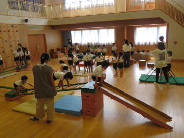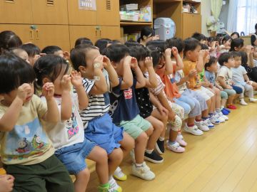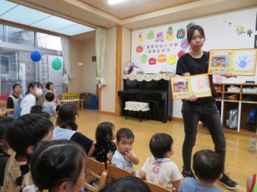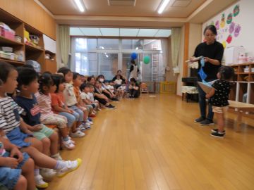 3歳以上のお友達は遊戯室で誕生会を行いました。園長先生に「むしのこえ」の歌を教えていただき、掛け合いで歌いました。