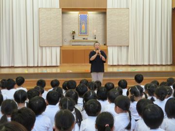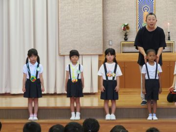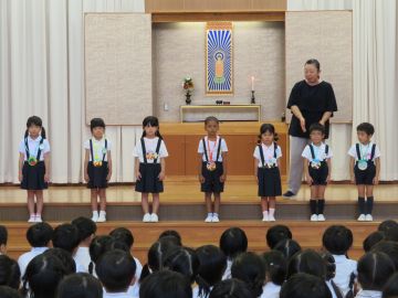 7人のお友達がステージに並び、園長先生からペンダントをかけていただきました。今月のペンダントは、「とんぼ」です。