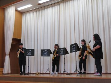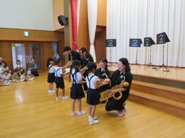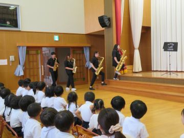 サックスを吹きながら入場!それぞれのサックスの音を聴かせていただいたり、こども達も知っている曲を演奏してくださいました。
