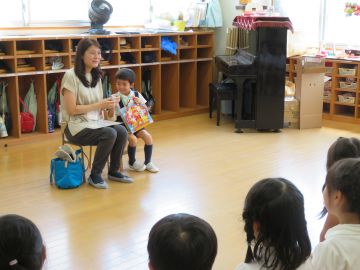 年中さんは、お子さんのお気に入りだった物や写真を見せていただきながら、小さい時のお話を聞かせていただきます。