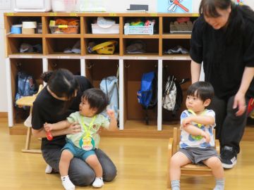 みんなで「とんぼのめがね」を歌っています。2歳のお友だち、とても元気に歌えました。