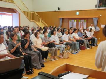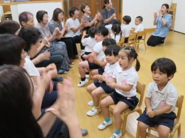 「海のそこにはあおいうち」、「気のいいあひる」で一緒にリズム遊びをし、最後は会場の皆さんとで「ゆうやけこやけ」を歌いました。