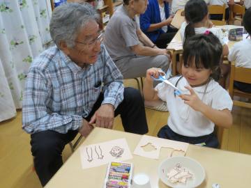年中さんが祖父母の方と一緒に作っているのは、けん玉です。