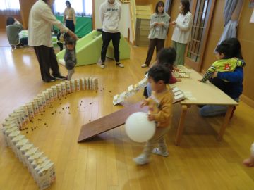 どんぐりを転がして遊びました。勢いよく転がる様子や音に興味津々。何度も繰り返します。