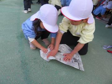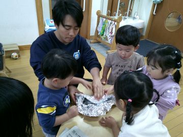 年少さんは、年長さんにお芋の包み方を教えてもらいました。2歳のお友だちは先生とお芋を包んでいます。