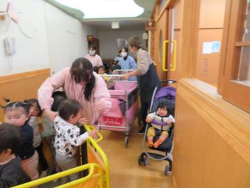 0.1歳のお友だちは、先生に散歩車に乗せてもらって速やかに避難します。