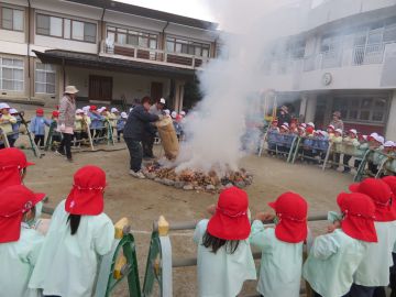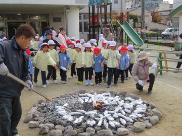 そろそろ焼けるかな? 年中さんと年長さんは火の回りに集まってきました。