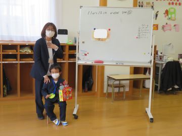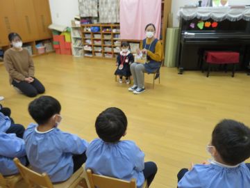 保護者の方から年長さんはお子さんの名前の由来、年少・年中さんは小さかった時の写真やお気に入りの物を見せていただきます。