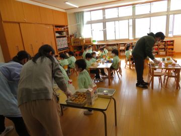 保護者の方に給食の準備や配膳をお手伝いいただき、皆でいただきます。