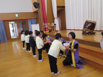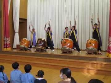 今月のアトラクションは、心鼓毬 彩さんの太鼓。園の職員も所属しており、一緒に太鼓を打って見せてくれました。