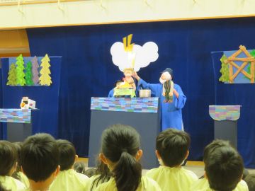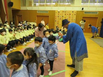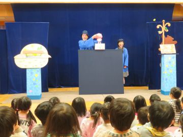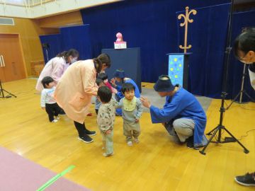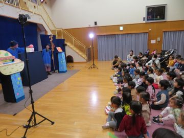 むすび座さんにお越しいただき、未満児は「どんどこももんちゃん」、3歳以上児は「かみなりカレー」を観劇しました。