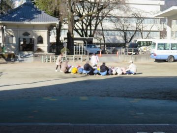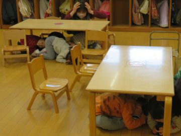 園庭にいたお友だちは建物から離れて園庭の真ん中でダンゴムシポーズをして、お部屋にいた友だちは机の下に入って揺れが落ち着くのを待っています。