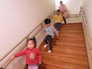 揺れが収まってから園内にいたお友だちは園庭に避難します。2階のお友だちは落ち着いて階段を下りました。