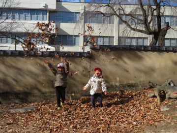 風に乗って葉っぱがヒラヒラと落ちてきます。寒さに負けずに、開放的に遊ぶこども達です。