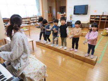 先日見せてもらった、劇とリズムの会の年少さん年中さんのように先生のピアノに合わせて歌って演奏していました。