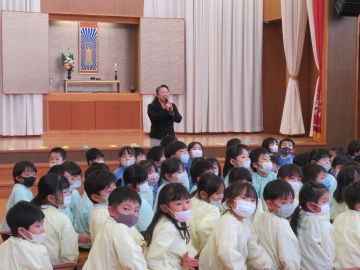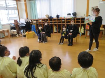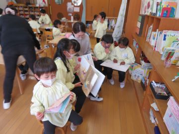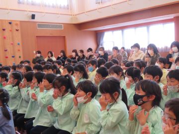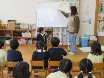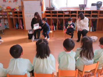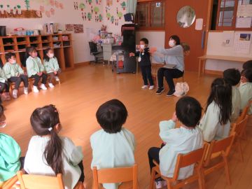 園長先生とクイズや手遊びをしたり、年長さんの大好きな歌「カレンダーマーチ」を聞かせてもらいました。