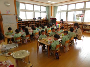 給食は、保護者の方(おとうさん先生・おかあさん先生)に配膳をお手伝いいただき、みんなでいただきました。