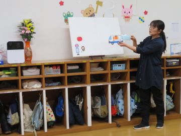 クラスに戻ってからは、年長さんは名前の由来、年中・年少さんはお子さんが生まれた時の写真やお気に入りの物を見せていただきながら保護者の方にお話をしていただきました。