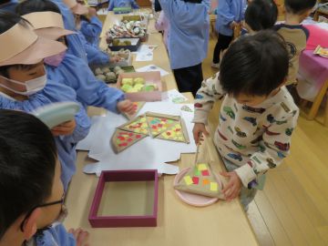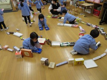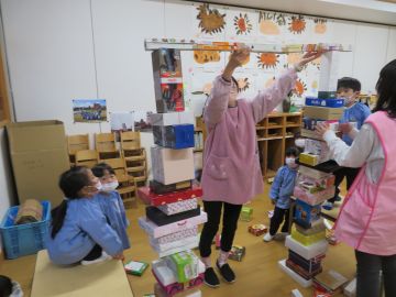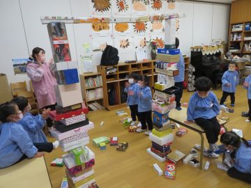 お家から持ってきていただいた箱で遊んでいる年少さん。