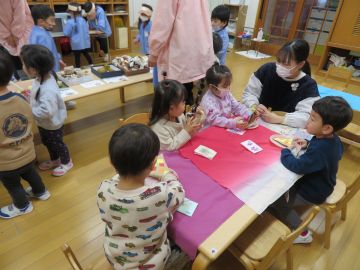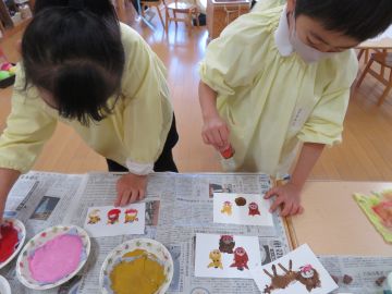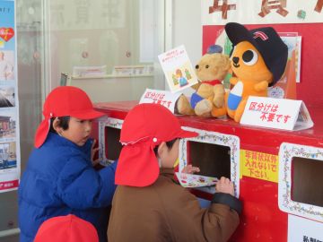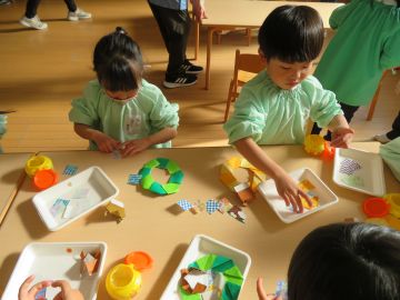形や色を考えながら組み合わせて作っていました。出来上がった年賀状は、郵便局に投函してきました。