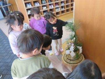 パン屋さんに2歳のお友だちが来てくれました。お客さんが好きなパンを取っています。手伝いたくなるのをちょっと待って見守る年少さん。お客さん皆で食べる場所も作って食べていってもらいました。