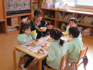 保護者の方に配膳を手伝っていただき、皆で給食です。