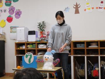 今月のアトラクションは、箱の中から色んなものが出てきて、、、最後に手袋や帽子をかぶった雪だるまになりました。