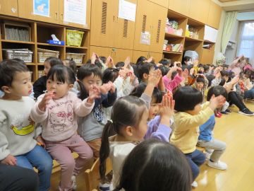 14日に誕生会があり、3歳以上児は遊戯室で行いました。