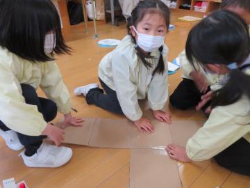 お正月の遊びとしてこま回しやすごろく遊びをしていたこども達、自分たちが進んでいく大きなすごろくを作ろう!と作り始めました。