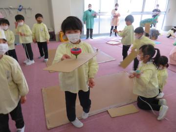 お正月遊びのこま回しも行っていました。技に挑戦したりチームごとの対抗戦をしたりする姿もありました。