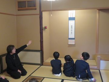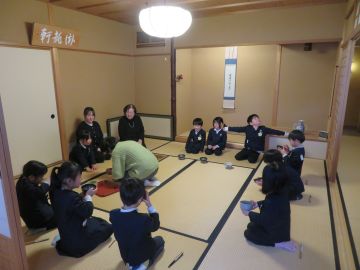 年長さんのお茶がありました。今回はお茶室の中の掛け軸やお花を見たり、実際にお菓子をいただいたりお茶を飲んだりしてみました。