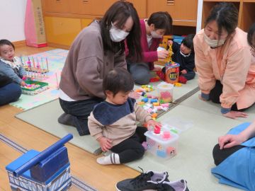 つくしさんは欠席のお友だちが多くて残念でしたが、プール室で体を動かして遊んだり、保育室で普段遊んでいる玩具で一緒に遊んでいただきました。
