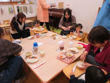 給食もお家の方と一緒。つくしさんは、離乳の進み具合に合う食材の提供や味付けなども見たり味わっていただきました。
