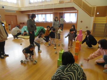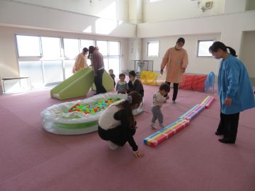 食後はプール室で普段している遊びを楽しみました。友だちと一緒に遊んだり、やりたい遊びを楽しむ姿をみていただけました。