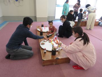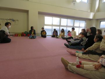 たんぽぽさんはプール室で遊んだ後に、お帰りのお集まりで手遊びを楽しんだり豆まきの話を聞いて「さようなら」をしました。